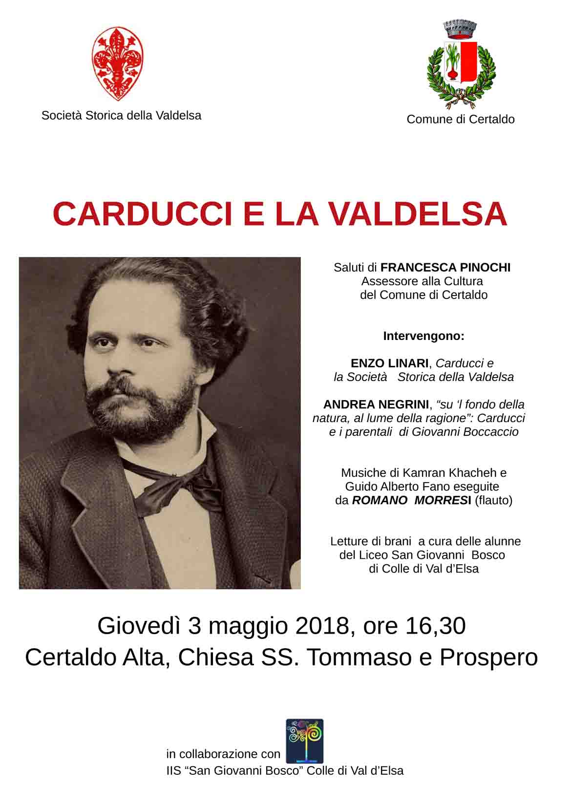 Nel 1893 Orazio Bacci, Presidente della Società Storica della Valdelsa da poco nata, propose di assegnare a Giosuè Carducci la cittadinanza onoraria “valdelsana”. Il poeta rispose tramite lettera, accettando con grande piacere questo riconoscimento, a testimonianza del legame che sentiva di avere stretto con questo territorio da quando nel 1857 aveva svolto un anno di insegnamento presso il ginnasio di San Miniato. In effetti su questo nostro “conterraneo” sulla «Miscellanea Storica della Valdelsa» e nella sua «Biblioteca» sono stati pubblicati vari contributi che, nella sua relazione, il prof. Enzo Linari ripercorrerà, mettendone in luce gli aspetti salienti. L’intervento del prof. Andrea Negrini sarà incentrato poi sull’analisi dell’importante discorso commemorativo pronunciato da Carducci a Certaldo nel 1875, in occasione del centenario della morte di Giovanni Boccaccio. L’iniziativa è arricchita da musiche ispirate alle opere di Carducci e di Boccaccio eseguite dal flautista Romano Morresi, e si avvale inoltre della collaborazione, per la lettura dei brani letterari, delle alunne del Liceo delle Scienze Umane “San Giovanni Bosco” di Colle di Val d’Elsa.