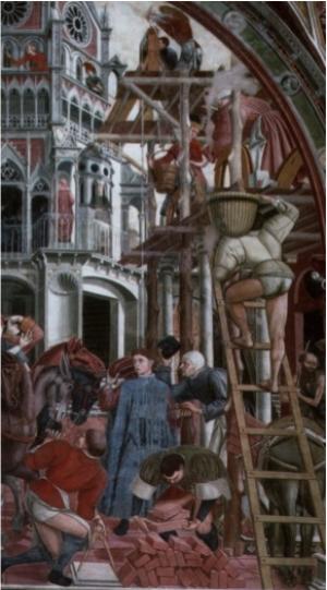 Tra il 1434 e il 1444 infatti tre pittori senesi, Lorenzo di Pietro detto il vecchietta, Priamo della Quercia e Domenico di Bartolo, artisti noti a Siena e anche aggiornati sulle novità stilistiche che si stavano diffondendo a Firenze, ricevettero l’incarico di notevole importanza della decorazione pittorica della sala principale dell’ospedale senese, chiamata pellegrinaio. L'idea era di fare di quello spazio, austero e solenne, non solo il luogo di accoglienza dei viandanti e dei malati, ma anche un luogo di rappresentanza nel quale fossero esaltate la grandezza e il prestigio dell’ospedale e celebrate la pietà, la carità, la munificenza, l’accortezza amministrativa dei suoi rettori.