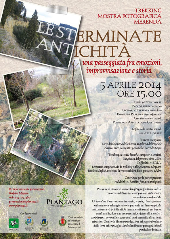 Questa volta saremo nella zona Nord-Ovest del territorio di Montespertoli, sulle colline che dividono la valle del torrente Turbone da quella dell’Orme. La conformazione litologica e le forme così particolari che il territorio assume in queste zone, hanno ispirato il titolo dell’iniziativa (Le sterminate antichità), preso a prestito da un’opera di un importante filosofo italiano del passato.